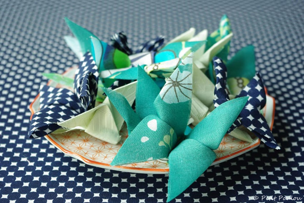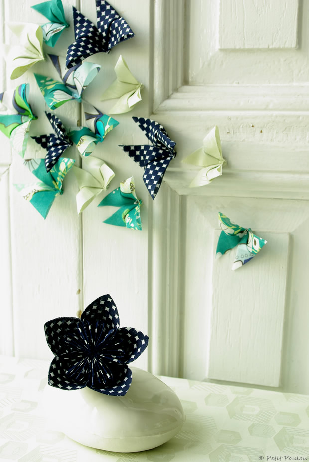 J’ai amidonné le tissu comme pour les papillons, j’ai suivi le pliage expliqué dans la video.