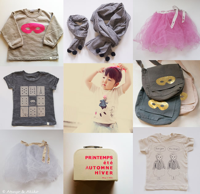 Une collection de vêtements et accessoires pour p’tits gars et p’tites minettes : des tee-shirts imprimés, des tutus, des p’tits sacs masqués, des doudous…